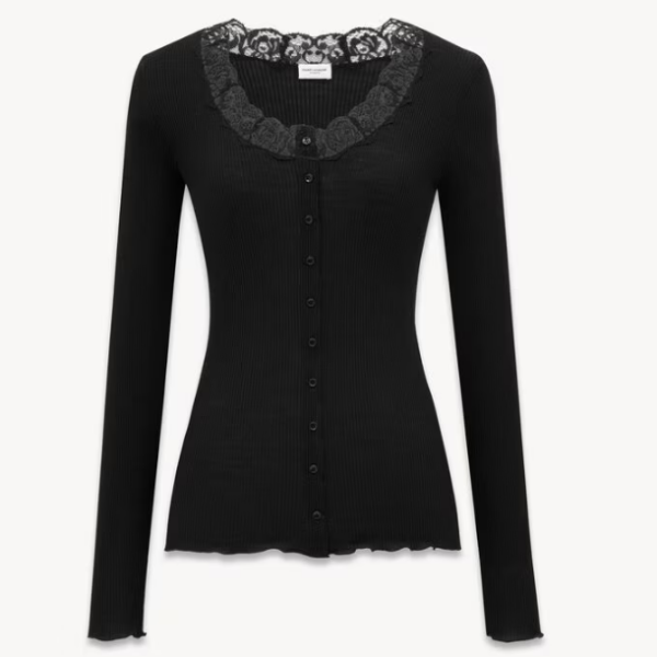 생로랑 립 디테일 울과 실크 소재의 레이스 가디건