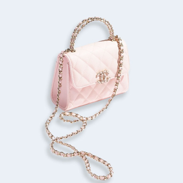 샤넬 유광 그레인드 카프스킨 골드 메탈 라이트 핑크 체인 미니백